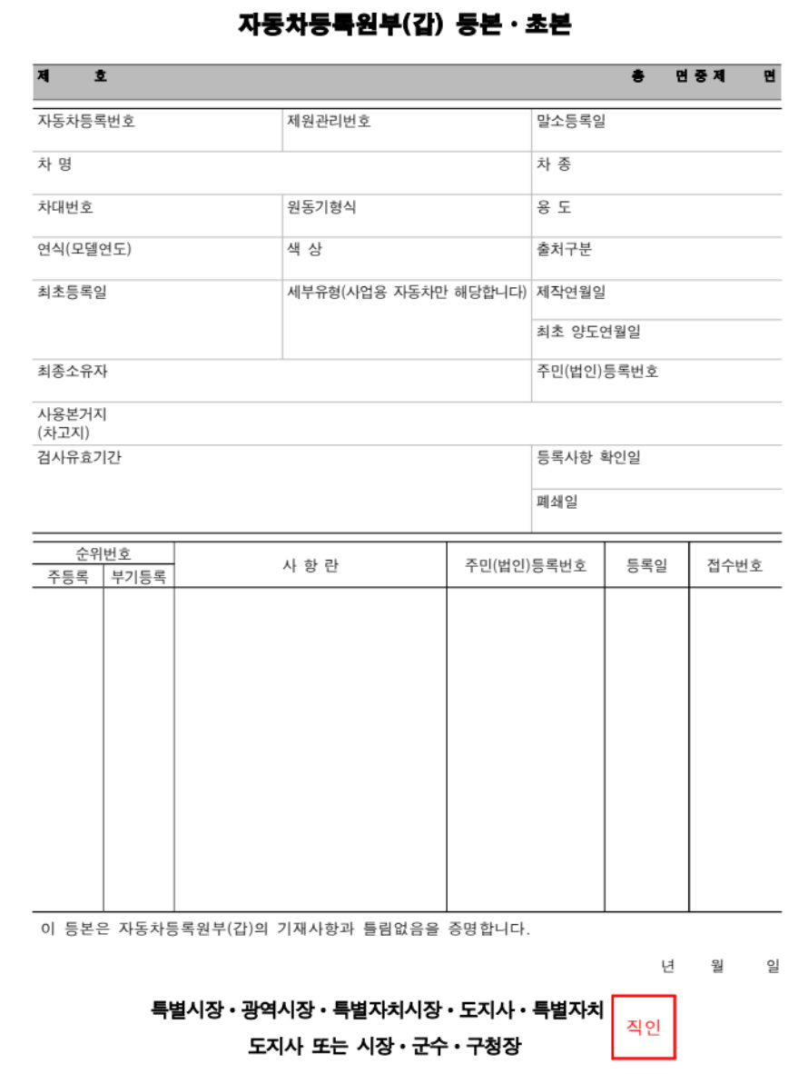 자동차등록원부는 "갑"과 "을" 두 가지로 구분됩니다. 두 양식의 차이점을 간단히 알아보겠습니다. 먼저, 자동차등록원부(갑)에는 차량 정보와 그간의 이력이 기록되어 있습니다.