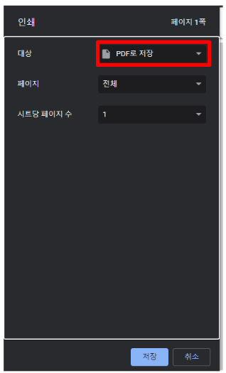 프린터가 없으시다면 아래 사진과 같이 대상 카테고리에서 PDF로 저장 을 선택하면 PDF 형태로 저장이 가능하고 메일로 전송하여 프린터가 있는 PC에서 출력하시면 되겠습니다.
