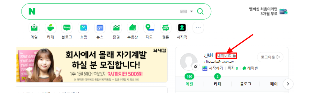 먼저 네이버 계정에 로그인을 합니다. 그리고 아래 이미지에서 보는바와 같이 '네이버 ID'를 클릭합니다.