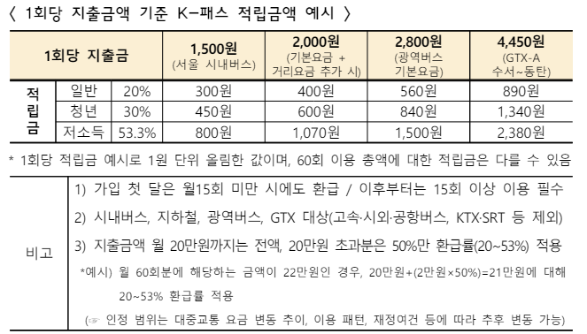 조금 더 자세히 설명드리면 월 15회 이상 정기적으로 대중교통을 이용할 경우 지출금액의 일정비율을 다음 달에 돌려줍니다. (일반인:20%, 청년층: 30%, 저소득층: 53.3% 환급)