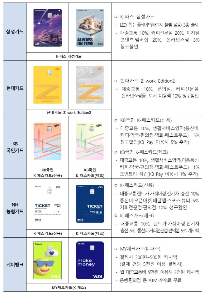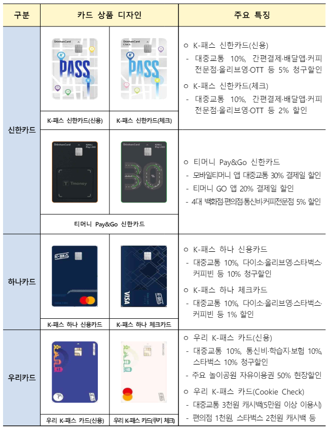 먼저 K-패스 전용 카드를 발급받아야 합니다. 신한, 하나, 우리, 현대, 삼성, BC, KB, 농협, 이동의 즐거움(이즐), DGB유페이 등의 카드사를 통해 발급가능한데요. 제가 발급을 위해 여러 카드사를 살펴보니 신용카드 형태로 나와 연회비를 요구하는 곳도 있었습니다.