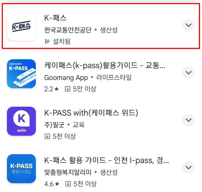구글스토어에서 K-패스를 검색하시면 아래와 같은 앱들이 보일 겁니다. 이 중에서 K-패스앱을 선택하시고 설치하시면 됩니다.