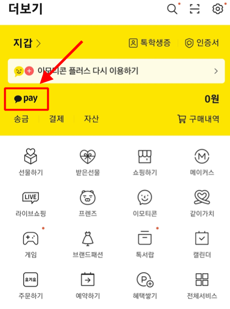 1) 먼저 카카오톡에서 더 보기 버튼을 눌러주면 아래와 같은 화면을 볼 수 있는데요. 여기서 Pay 버튼을 클릭해 줍니다.