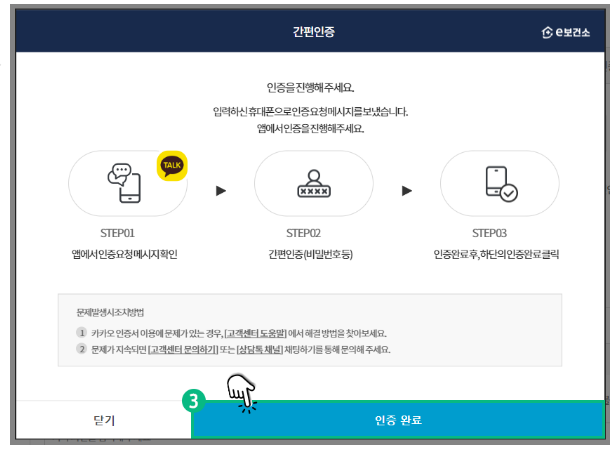 카카오톡 같은 경우 카카오톡으로 인증요청이 갈것이며 스마트폰에서 인증을 완료하시고 아래처럼 [인증완료]를 클릭하시면됩니다.