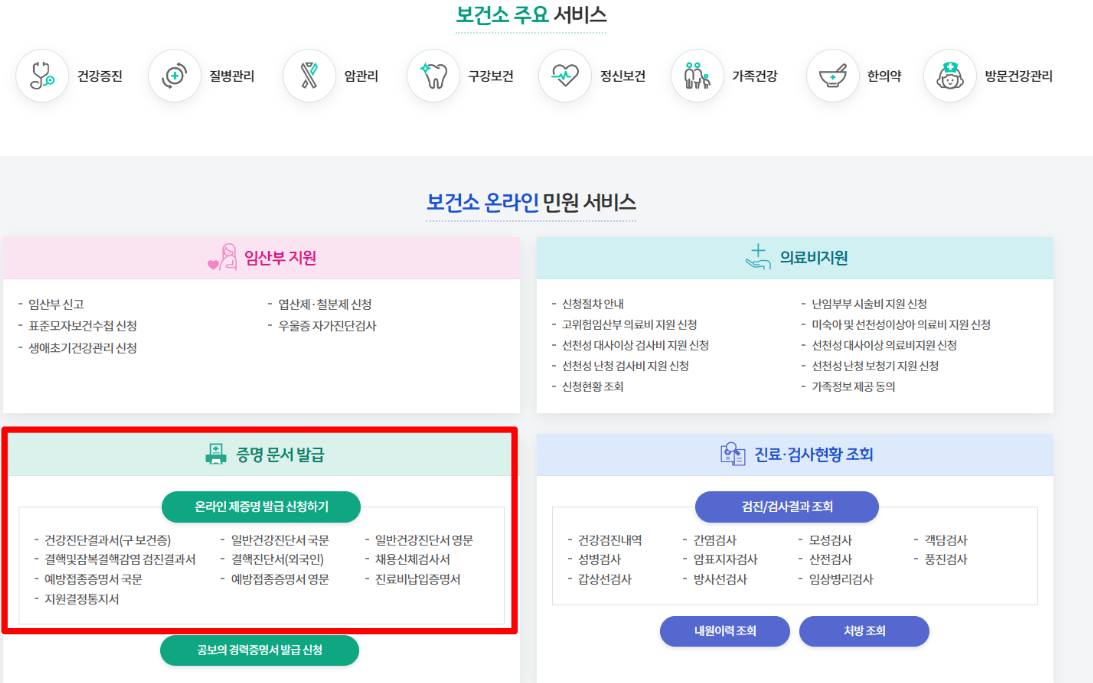 e보건소를 방문하면 아래와 같은 화면을 볼 수 있고요. 좌하단에 보시면 [증명문서발급] 란이 있습니다. 여기에서 건강진단결과서(구 보건증)을 클릭하시면됩니다.