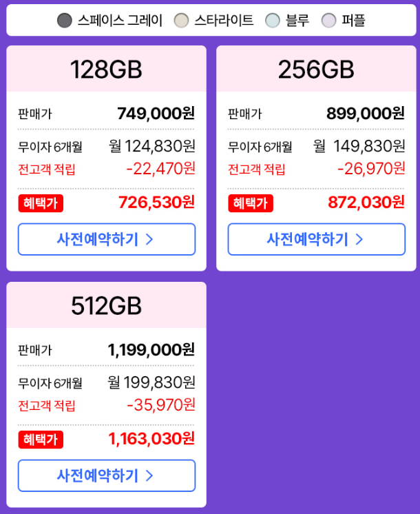 - 128GB: 749,000원 ▶️ 726,530원 (쿠팡 캐시 적립 할인)