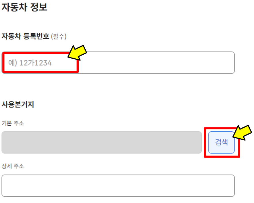 발급을 희망하는 [자동차 등록번호]를 입력하시구요. 현재 거주지를 검색하셔서 입력하시면됩니다. 상세주소는 간략하게만 적으셔도 상관없습니다.