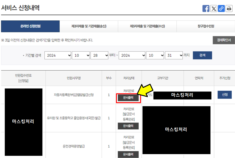 최종 신청서 작성이 완료되면 10초 이내에 아래와 같이 신청내역을 확인할 수 있습니다. [문서출력]버튼을 누르면 자동차등록원부 발급 또는 열람이 가능합니다.