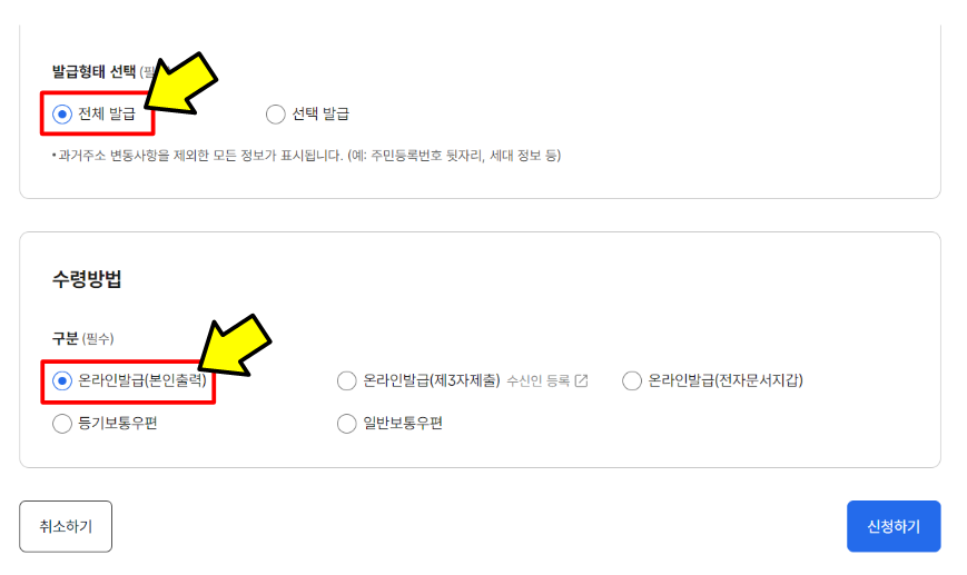 발급형태를 선택할 수 있습니다. 주민등록표에 어느 정도의 정보를 포함시킬 것인지 선택할 수 있습니다. 모르겠다면 그냥 [전체발급]으로 진행하여도 무방합니다.