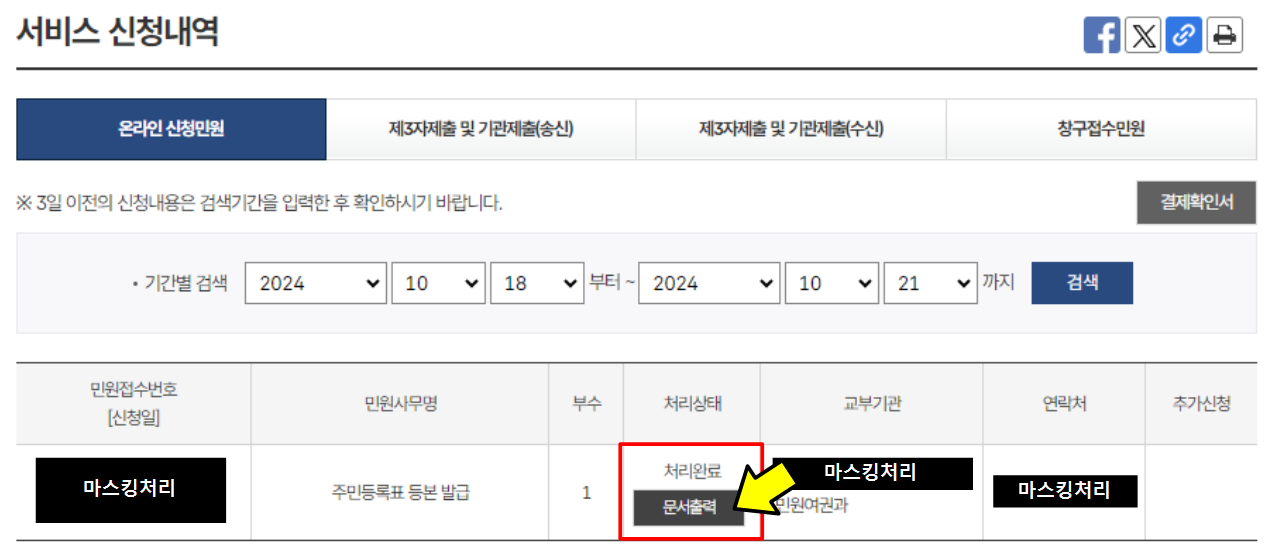 그럼 최종적으로 주민등록표 등본 출력에 대한 민원신청이 완료되었으며 아래와 같이 [문서출력] 버튼이 활성화 되는것을 볼 수 있습니다. 문서출력 버튼을 클릭하면 바로 프린트 출력이 가능합니다. 물론 프린터와 연결이 된 상태여야만합니다.