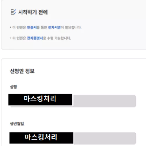 다음으로는 신청서를 작성하는 단계입니다. 신청하는 나의 정보 중 성명과 생년원일이 맞는지 먼저 체크해주시구요.