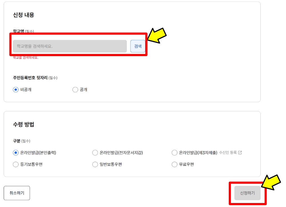 다음으로 중요한 것은 학교를 선택하는 것입니다. 이곳에서 검색을 통해서 유치원, 초등학교, 중학교, 고등학교 졸업 증명서 중 원하는 것을 선택할 수 있습니다. [검색]버튼을 눌러봅시다.