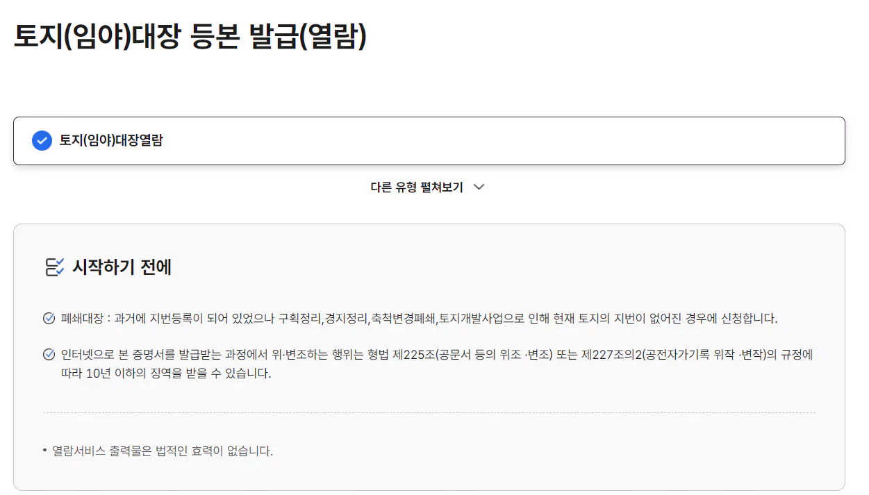 다음으로는 토지대장을 열람할지 또는 발급할지 선택하는 화면입니다. 열람을 하시려면 그대로 넘어가셔도 됩니다.