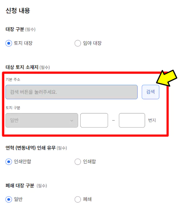 다음으로는 토지대장 또는 임야대장 중 선택을하고 확인하고자하는 대상 토지의 주소를 입력해야합니다.