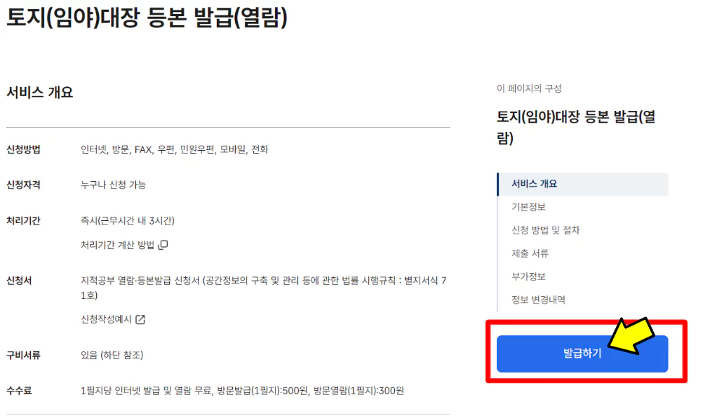 다음 페이지에서는 토지대장 발급 관련 간단한 설명이 나와있습니다. 한 번 읽어보신다음에 [발급하기] 버튼을 눌러줍니다.