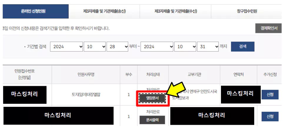 그럼 아래와 같이 토지대장열람에 대한 민원신청내역이 완료되어 문서열람 버튼이 활성화된 것을 확인할 수 있습니다. 이 [문서열람] 버튼을 눌러주면 토지대장을 확인할 수 있습니다.