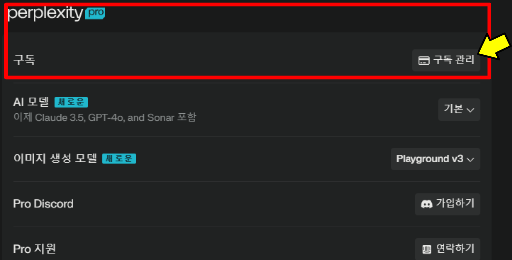 톱니바퀴를 클릭하면 설정페이지가 보입니다. 하단으로 조금 내리다 보면 퍼플렉시티 프로버전 관련 내용이 보입니다. 저는 이미 구독했기 때문에 구독관리로 보이지만 아마 여러분은 [구독하기]로 보일거예요. 그것을 클릭해줍니다.