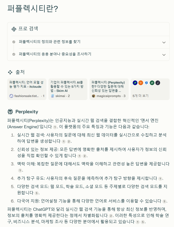 특히, 퍼플렉시티는 단순히 답변만 제공하는 것이 아니라, 모든 정보의 출처를 명확히 제시합니다. 이는 사용자가 받은 정보의 신뢰성을 직접 확인할 수 있게 해주며, 학술 논문과 같은 신뢰할 수 있는 출처의 정보까지 폭넓게 분석하여 종합적인 답변을 제공합니다.