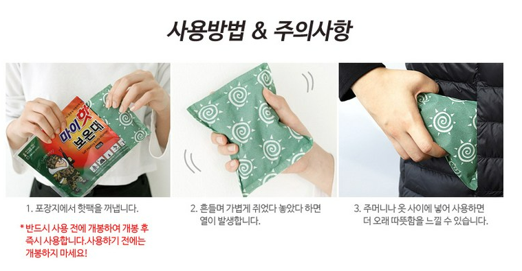 제가 최근 애용하는 핫팩 중 하나입니다. 여러 다른 회사의 핫팩보다 실제 따뜻함의 지속시간이 높습니다. 내용물이 손에 묻어 나오지도 않아 깔끔한편입니다.